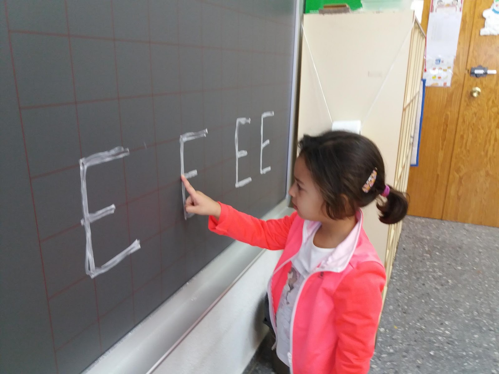 Para interiorizar bien el trazo de la letra, primero lo realizan en la pizarra repasando sobre la tiza: